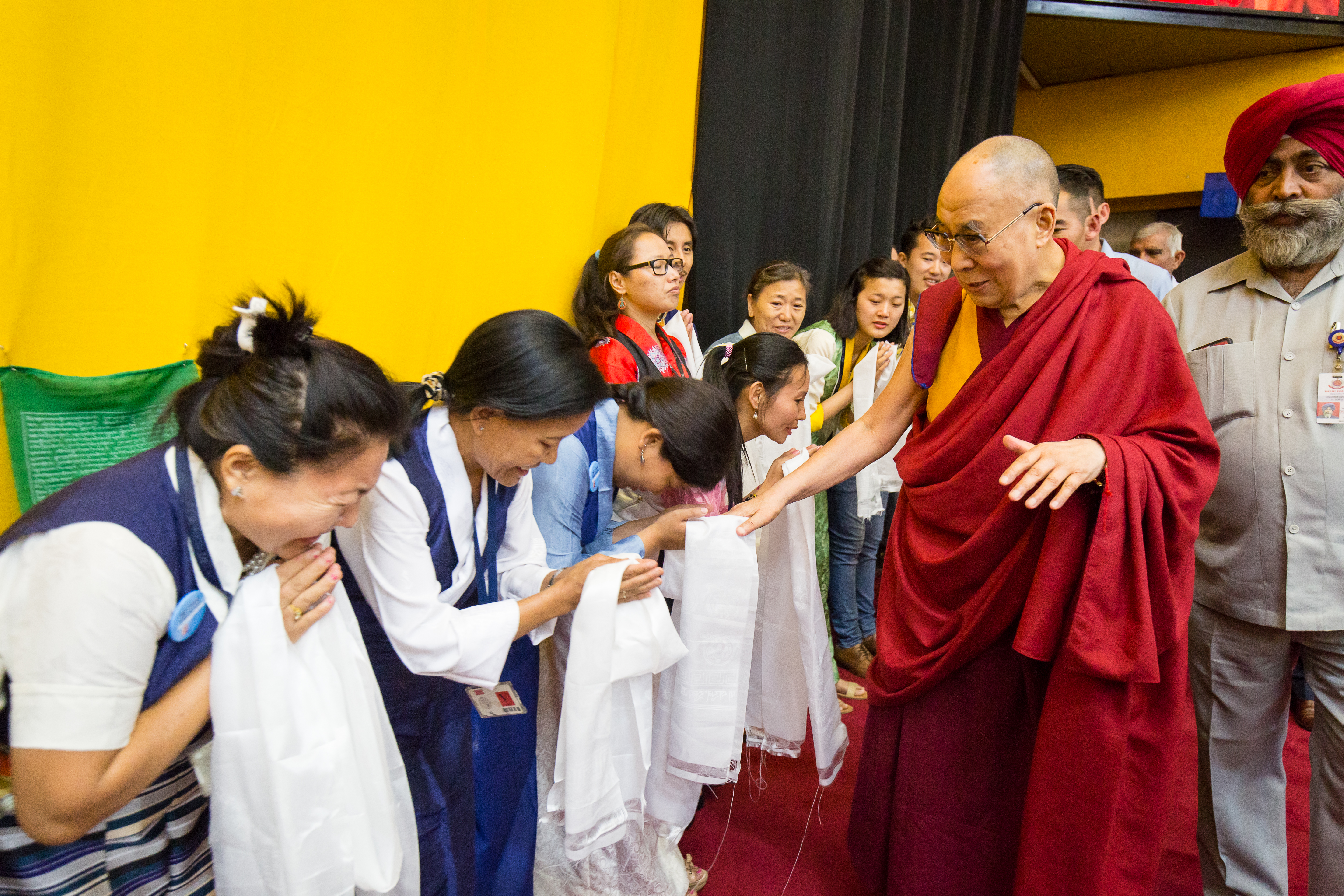As the Dalai Lama passed through the doorway to the gym, the crowd stood. One of the Tibetan maids began to weep, her cries breaking the silence. He worked his way toward the stage, taking his time and engaging with those along the way, sharing a good laugh with a wheelchair-bound guest who had met him before, blessing the khatas and gently patting the bowed heads.