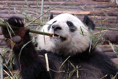 Our driver, Luo Shifu, parked the car, and our guide, Deng Li, took us into the park. We wandered off the beaten path and wondered where we were going, but then Deng Li told us he knew some people who worked here so he was trying to get us access to the adult panda “dormitory” while the staff was at lunch. A worker eyed us suspiciously but then told us to be quiet and gestured for us to enter. We climbed a ladder to view the enclosures from above, and then we climbed down to look through the bars of each area’s gate. Most of the adult pandas sat next to their gates, reaching through the bars to pull in armloads of bamboo. Then they’d roll onto their backs and use their teeth to peel off the outer bark before munching on the tender stalks. Adult pandas can eat 20 kilos (44 pounds) of bamboo each day. So much for taking one home as a pet …