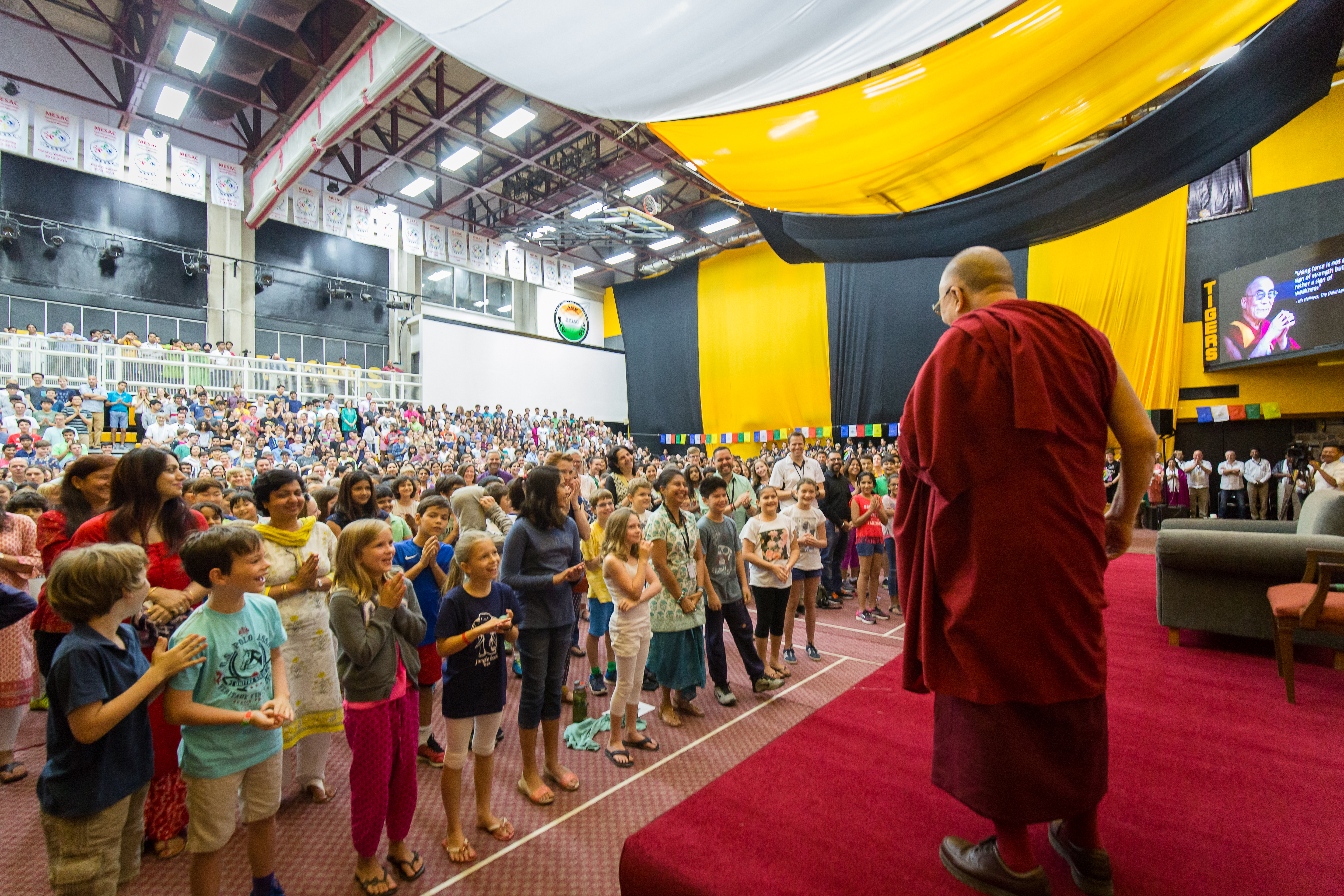 I entered the gym and sat with Tony in the bleachers. The usual rumble of chatter echoed off the walls, which were draped with black and gold, our school colors. The stage remained quiet, Tibetan prayer flags stretched across the backdrop and a comfy chair awaiting the arrival of His Holiness. After awhile, the head of Indian Studies got on the mic and encouraged us to quiet down and get our minds in a more meditative space. A hush fell over the gym, and even our youngest students remained calm until we were dismissed, more than 90 minutes later.