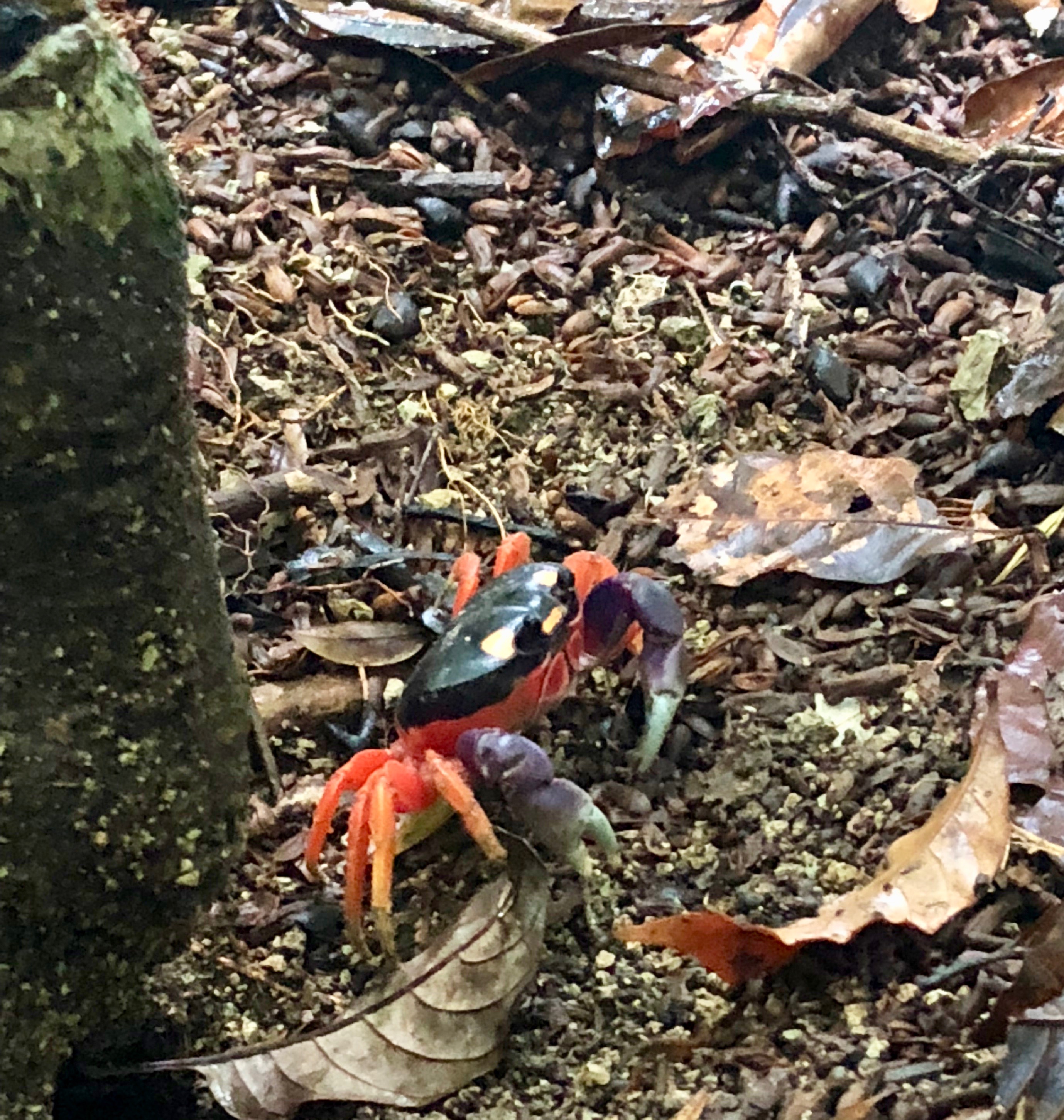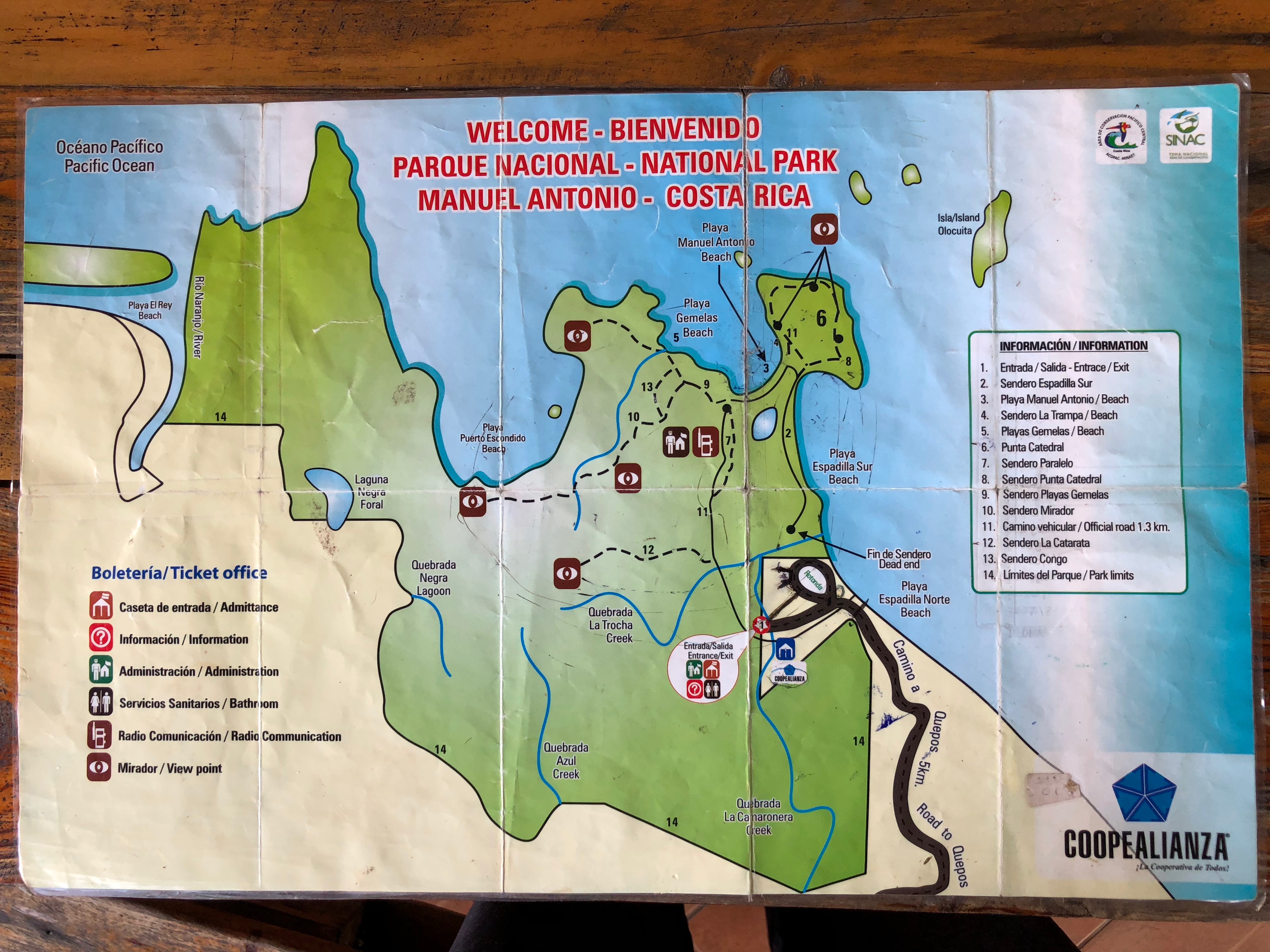 Most trails were paved, and hills generally had easy-to-maneuver stairs or ramps. Bathrooms popped up periodically. As jungle hikes go, it was a fairly chill place to visit. We saw one sloth, a couple agoutis (those giant hamsters), a few cool birds and colorful crabs, and the blue morpho butterflies, which freak you out with their flashes of iridescence. I appreciated both the high-level coastline and rainforest views, as well as the ground-level access to the beaches and forest floor. As we were leaving around noon, mobs of people were going in. Tony and I smugly high-fived over having the park mostly to ourselves.