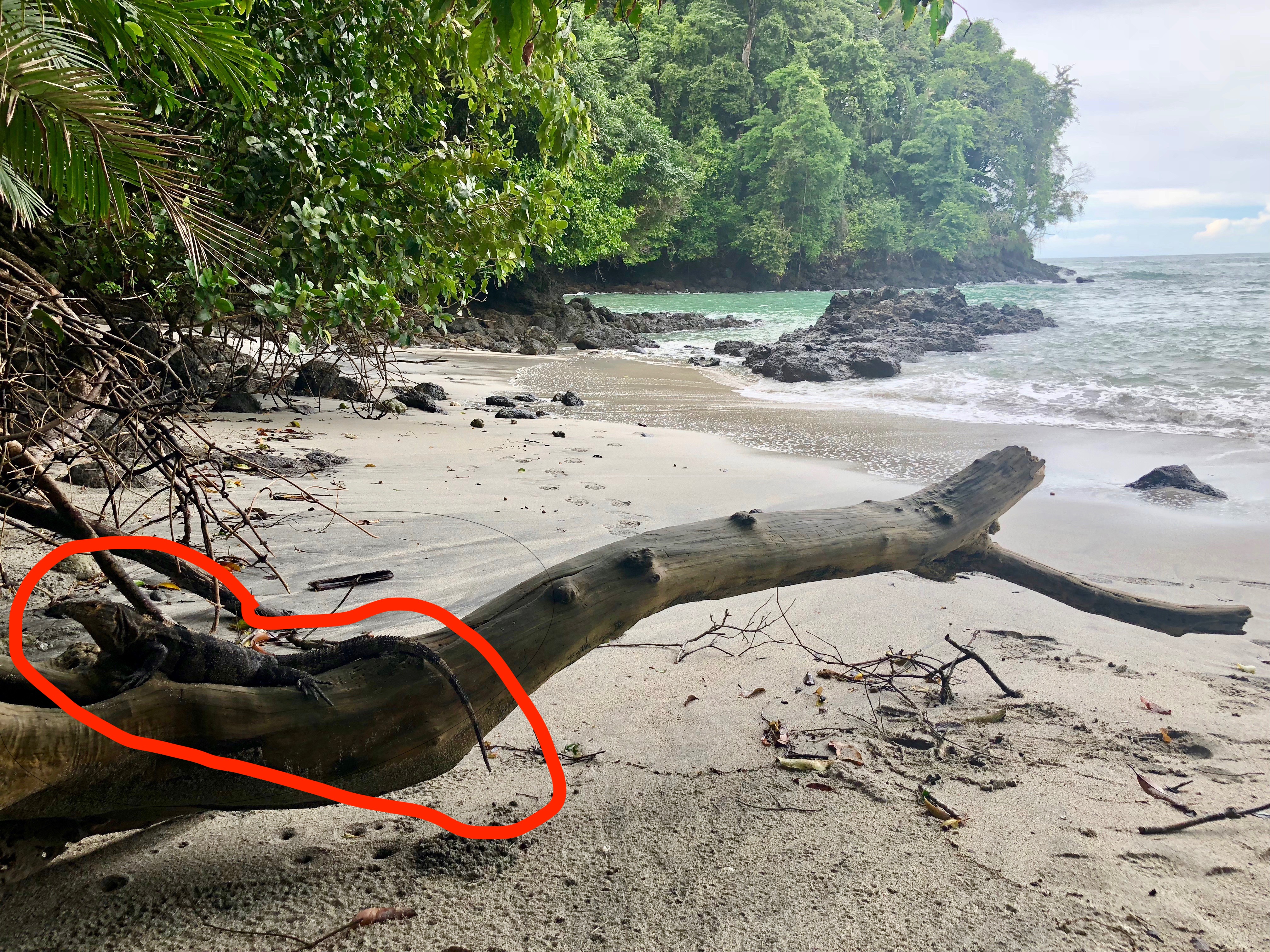 Tony, wearing his Tevas, ventured into the surf a bit more than I did, laced as I was into my hiking shoes. At one point, he wandered up the beach while I rested on this fallen tree, soaking up the sounds and smells of the ocean. I sat here for more than five minutes before I realized my seat mate was a ginormous iguana. How did I miss him?
