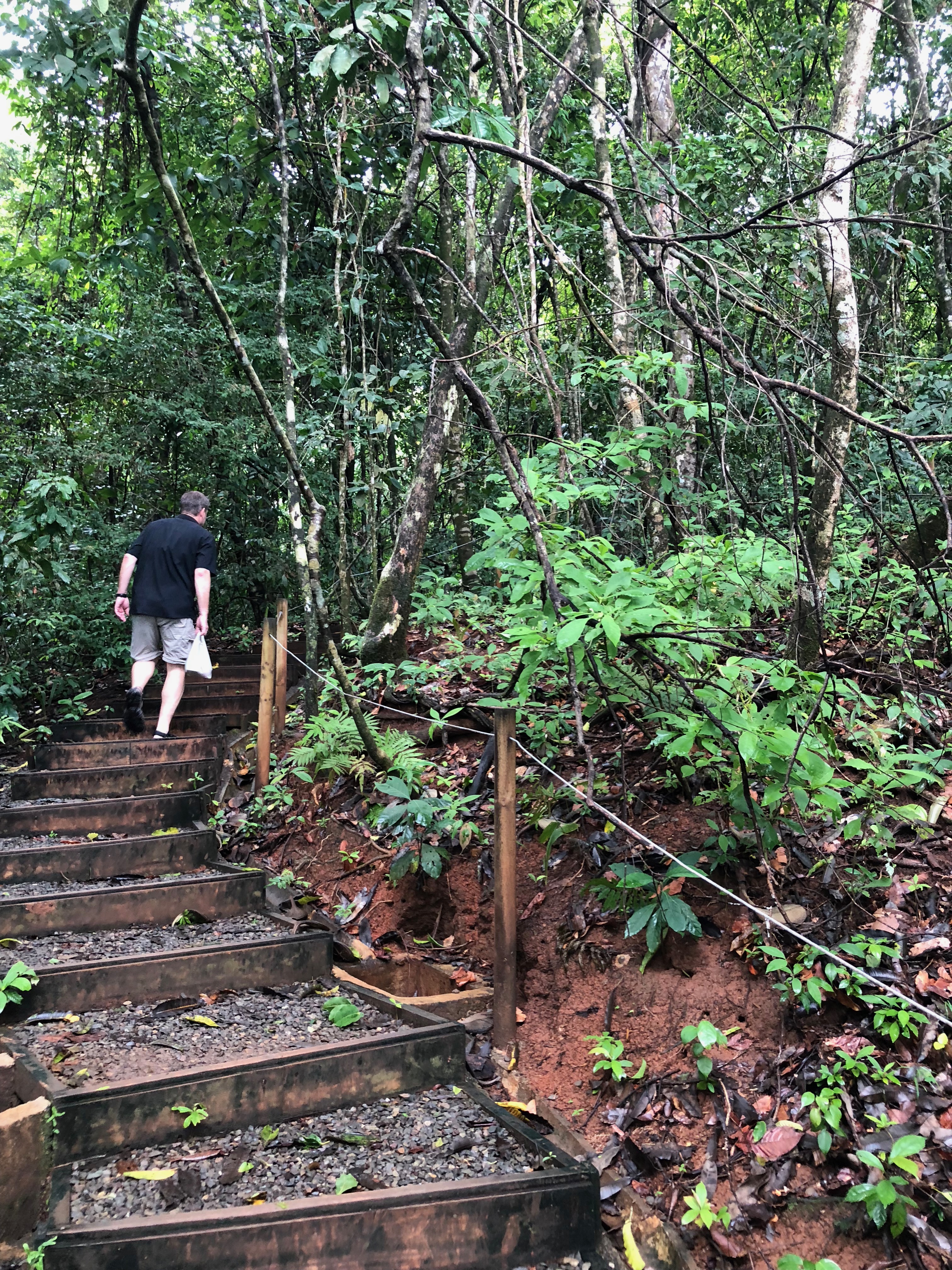 FYI, the combination of 100 percent humidity, gravity, and the action of moving our bodies to trek up and down hills actually results in clothes stretching several sizes, and my awesome hiking pants were easily three inches longer by the end of this day. Our clothes were drenched with sweat, and my fingers shriveled like raisins from the weird combination of dehydration and perspiration.