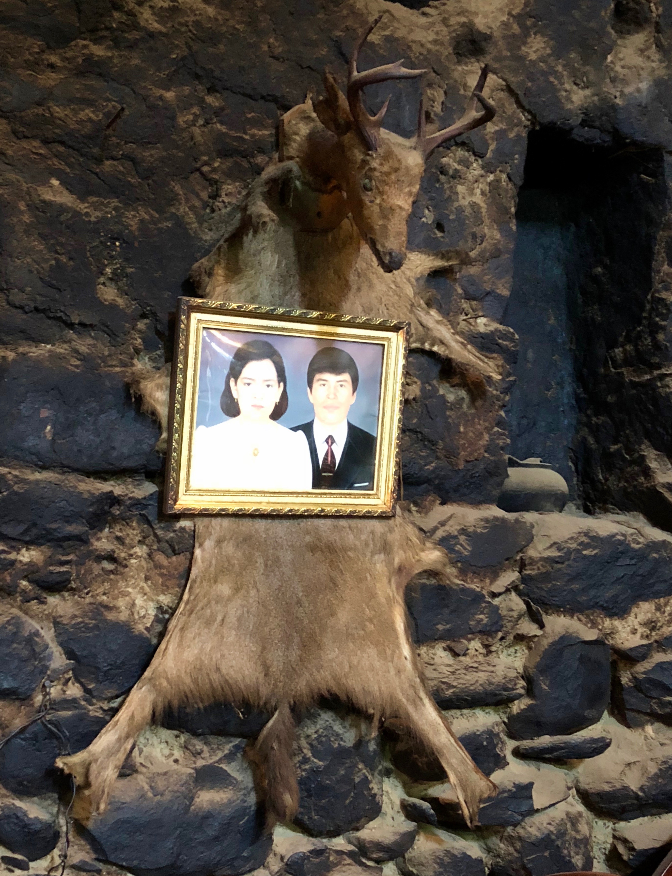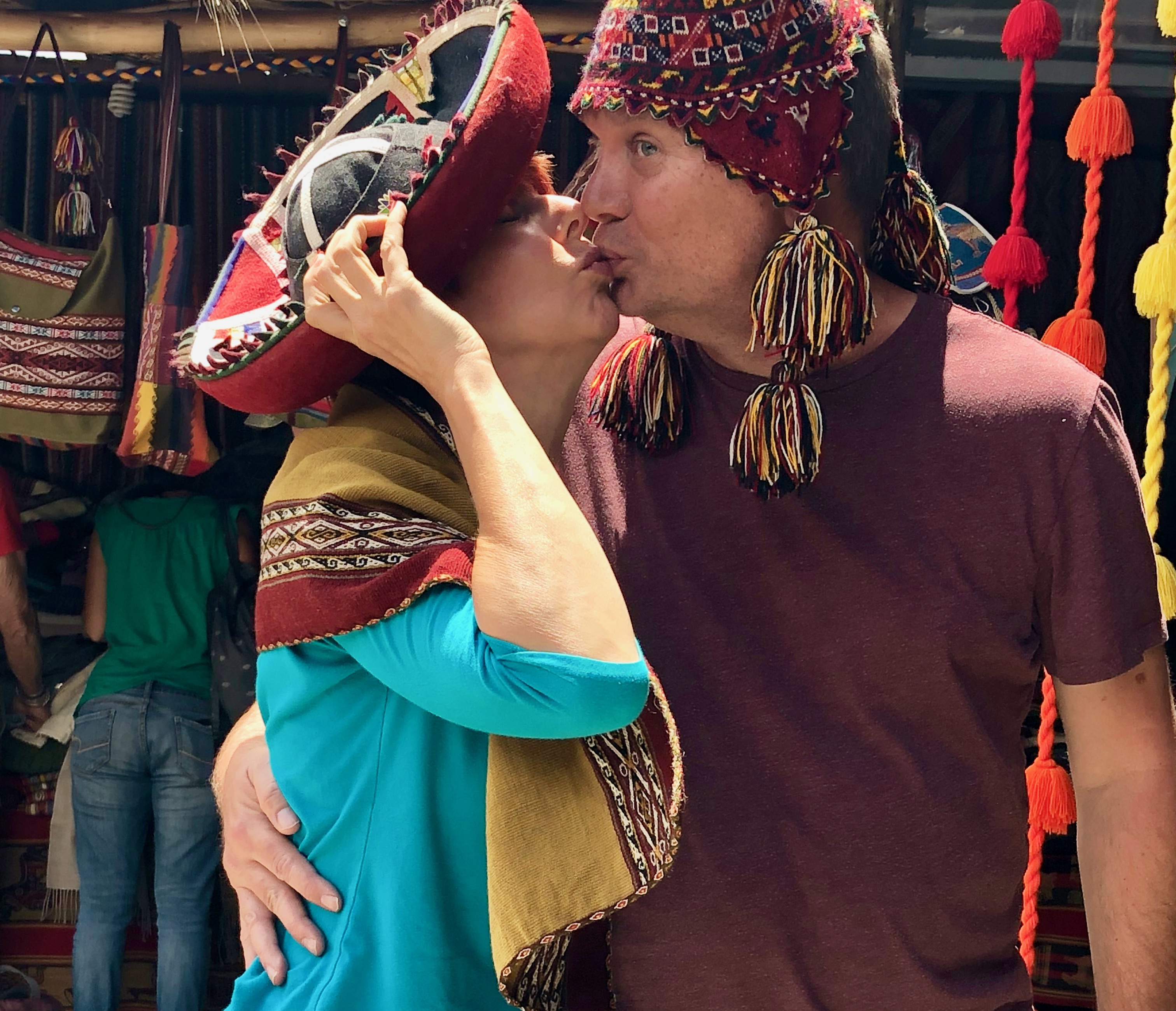 Tony and I bought a table runner from a husband and wife weaving team, and before we could stop them, they had placed the runner around my shoulders and put their own hats on our heads so we could pose for a photo.